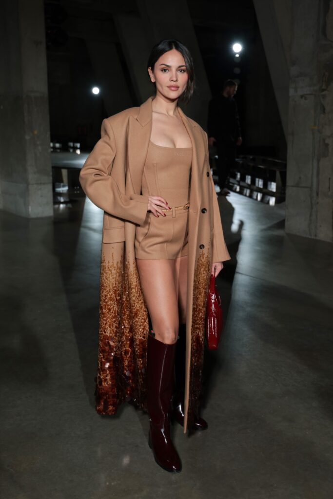Η ηθοποιός Eiza González επέλεξε έναν μπεζ κορσέ και σορτς, πάνω από τα οποία φόρεσε ένα παλτό με παγέτα στο κάτω μέρος. Ολοκλήρωσε το look με μια κόκκινη μπορντό τσάντα και λούστρινες μπότες.