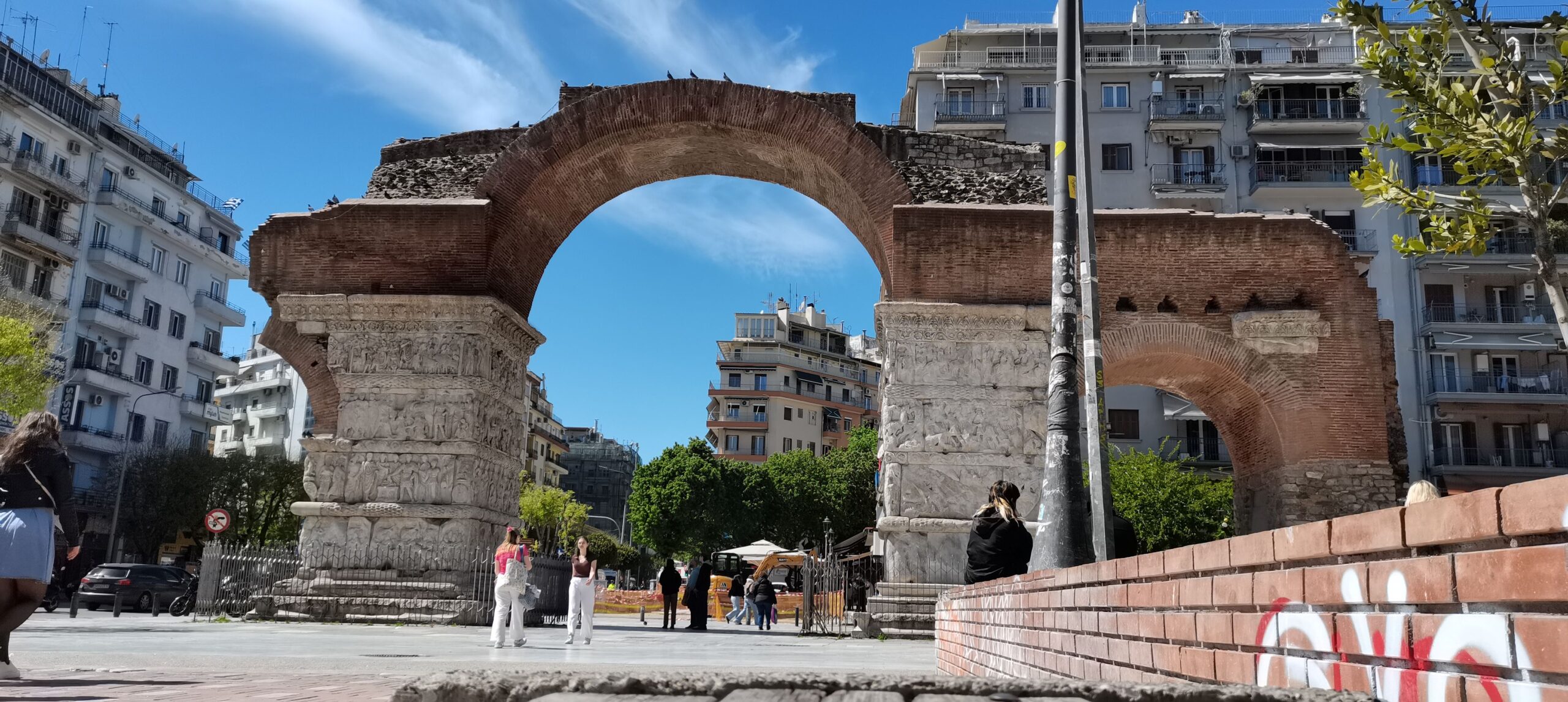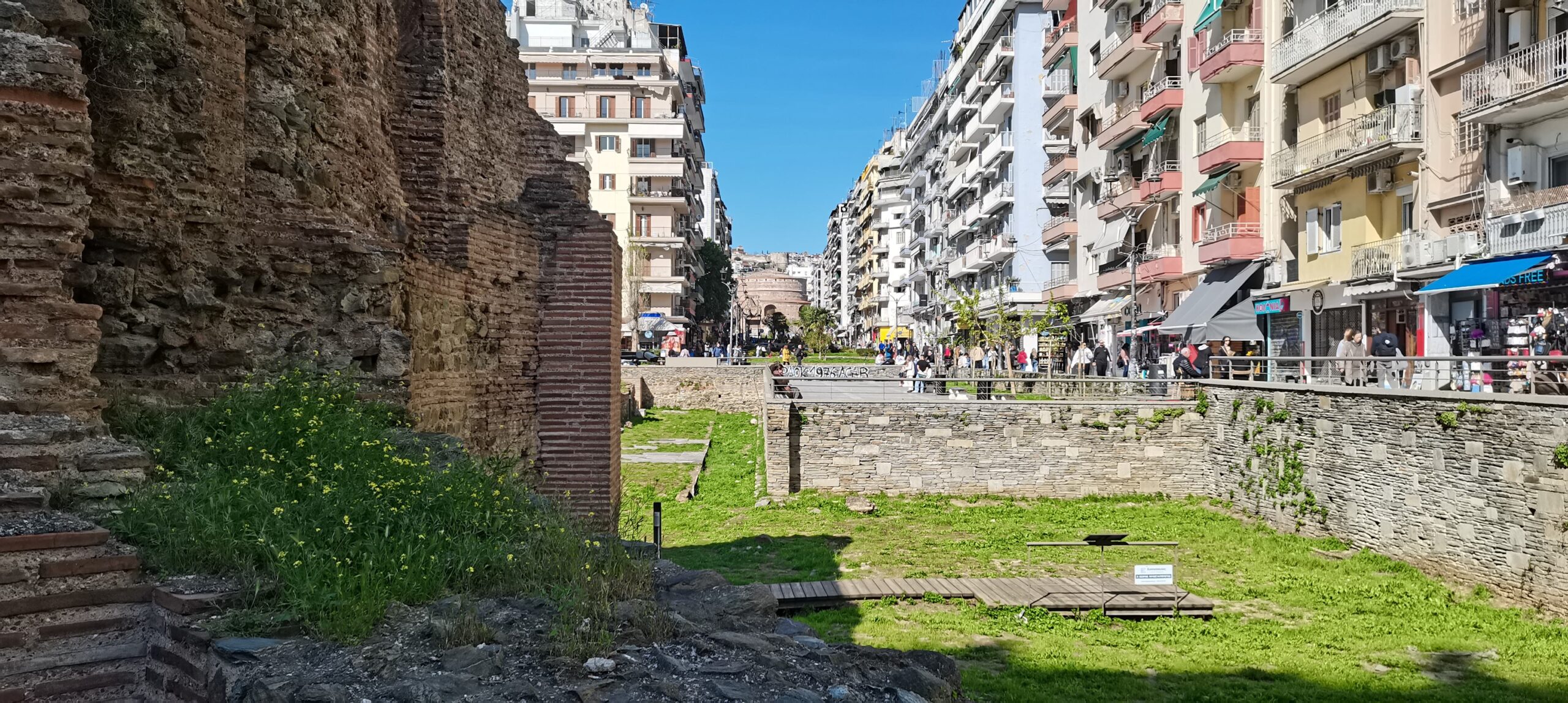 Συνεχίζοντας την ανοδική μας πορεία φτάνουμε στην Αψίδα του Γαλέριου. Είναι η γνωστή Καμάρα όπου δίνουν ραντεβού οι φοιτητές για τις βραδινές εξορμήσεις τους προς όλες τις περιοχές του κέντρου. Στις μέρες της Ρώμης η αψίδα επεκτεινόταν προς τις δύο της άκρες, ενώνοντας το ανάκτορο του Γαλέριου με την Ροτόντα προς τα πάνω.