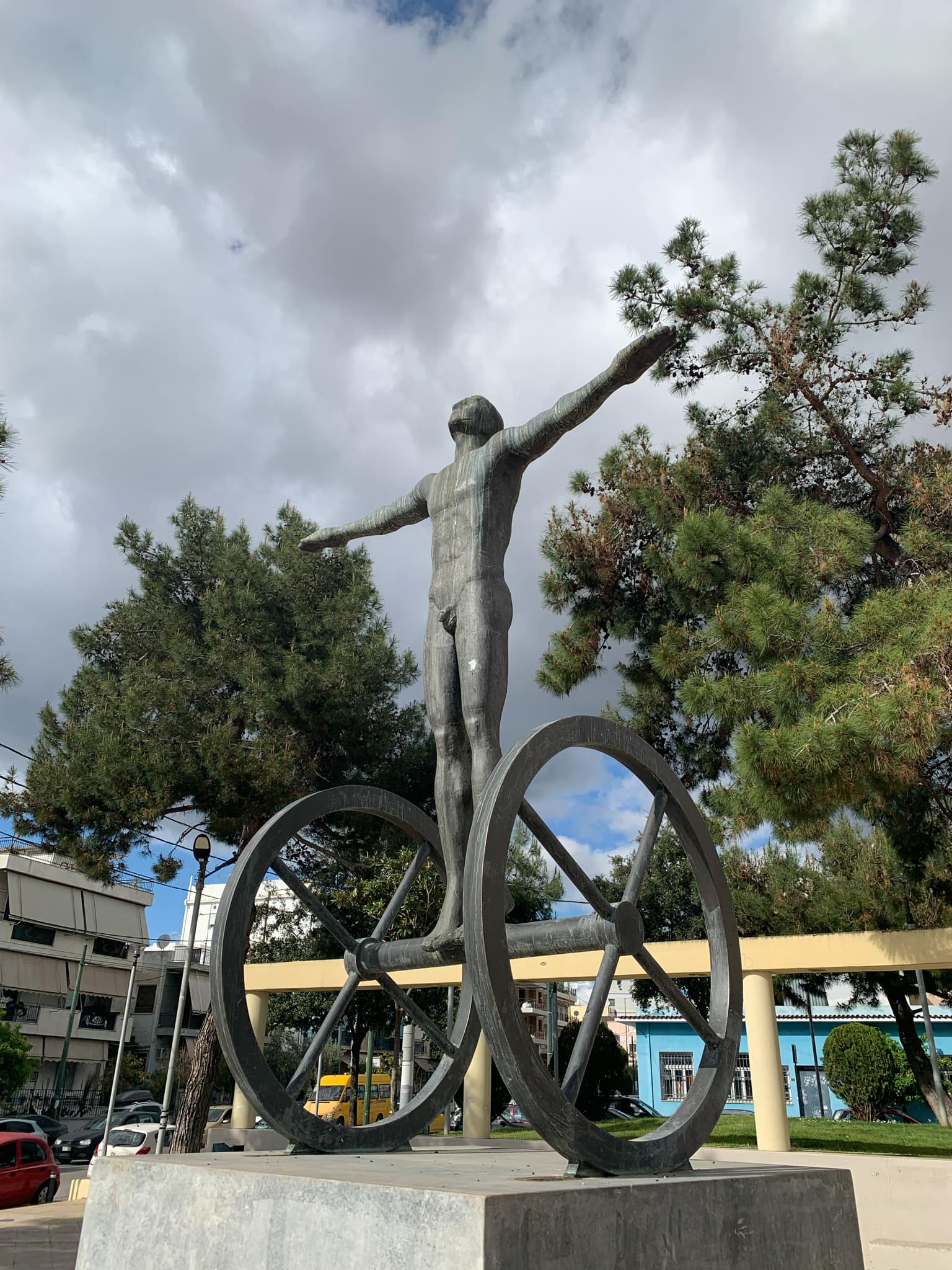 - Ένα ακόμα γλυπτό του Ευάγγελου Μουστάκα, το οποίο κοσμεί το Περιστέρι, είναι ο λεγόμενος «Κούρος Ισορροπιστής». Τοποθετήθηκε στην πλατεία στη συμβολή των οδών Παναγή Τσαλδάρη και Ραβινέ το 2009 και αναπαρίσταται ένας κούρος, δηλαδή ένας νέος, καλλίγραμμος άνδρας, ο οποίος γυμνός με τα χέρια τεντωμένα και το κεφάλι άνωθεν προσπαθεί να ισορροπήσει πάνω σε έναν άξονα ο οποίος συνδέει δύο τροχούς. Η πλατεία που φιλοξενεί τον «Κούρο Ισορροπιστή» αποτελεί ένα μέρος που επισκέπτονται και θαυμάζουν όλοι όσοι έρχονται στο Περιστέρι.