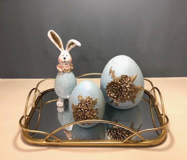 Όλοι έχουμε καταχωνιασμένο κάπου στο σπίτι έναν δίσκο σερβιρίσματος, που μπορούμε να του δώσουμε το ανάλογο ύφος διακόσμησης ανάλογα με την εποχή. Είτε είναι ξύλινος είτε δίσκος καθρέπτης σε χρυσή ή ασημένια απόχρωση, θα απογειώσει τόσο την πασχαλινή όσο και την ανοιξιάτικη διακόσμηση. Πάρτε έναν ή περισσότερους δίσκους της αρεσκείας σας και διακοσμήστε τους με κεριά ρεσό, αυγά με θεματικές παραστάσεις και πασχαλινές φιγούρες, όπως λαγουδάκια.