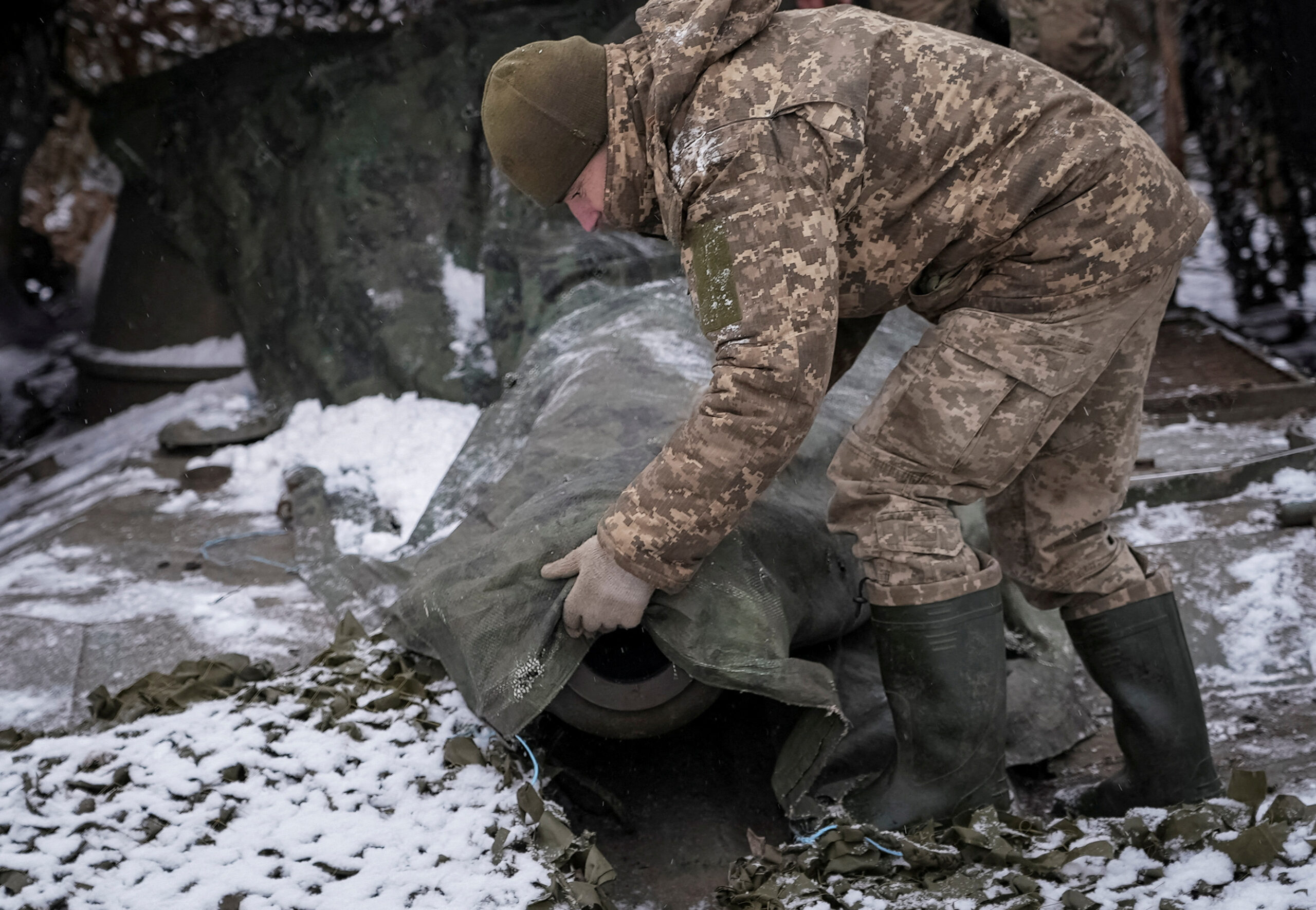 FILE PHOTO: A Ukrainian serviceman of 93rd brigade camouflages a 2S1 Gvozdika self propelled howitzer at a front line, amid Russia’s attack on Ukraine, near the town of Chasiv Yar in Donetsk region, Ukraine February 22, 2024. REUTERS/Inna Varenytsia/File Photo
